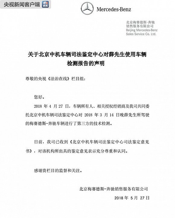 在这份奔驰《关于北京中机车辆司法鉴定中心对薛先生使用车辆检测报告的声明》中,奔驰表示,公司已经收到《北京中机车辆司法鉴定中心司法鉴定意见书》,对该机构所出具的鉴定意见表示充分尊重和认同。
