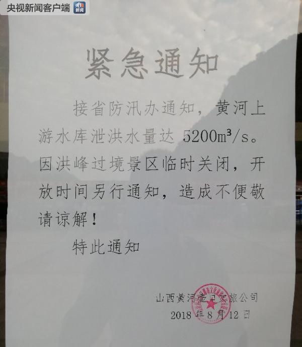 8月12日,受黄河上游水库泄洪影响,黄河壶口段水流量每秒多达5200立方米,为保障游客安全,黄河壶口瀑布景区目前采取临时关闭措施。(央视记者 裴大伟)