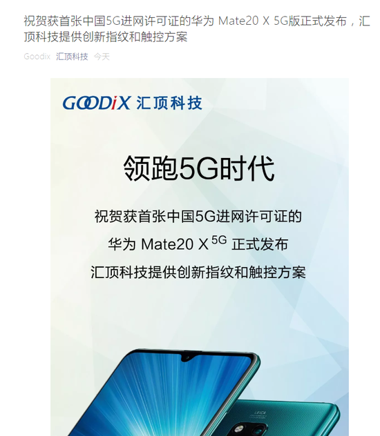 新浪财经讯 7月26日消息,汇顶科技(162.500, 6.50, 4.17%)在官方微信上表示,为华为首款5G手机提供指纹和触控方案。