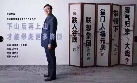 “一度跌入谷底的联想集团,如何在掌门人杨元庆的带领下,演绎出霸气归来的大戏?”五扇大屏风上加黑加粗的大字,旁边是和屏风一样宽的杨元庆,配上了一句“下山后再上山才能攀爬更多峰顶”。