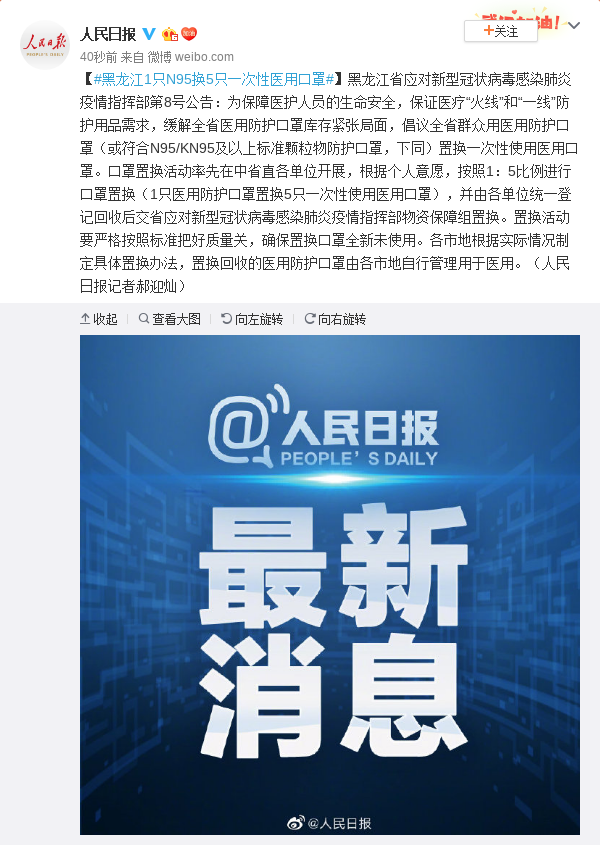黑龙江省应对新型冠状病毒感染肺炎疫情指挥部第8号公告:为保障医护人员的生命安全,保证医疗“火线”和“一线”防护用品需求,缓解全省医用防护口罩库存紧张局面,倡议全省群众用医用防护口罩(或符合N95/KN95及以上标准颗粒物防护口罩,下同)置换一次性使用医用口罩。口罩置换活动率先在中省直各单位开展,根据个人意愿,按照1:5比例进行口罩置换(1只医用防护口罩置换5只一次性使用医用口罩),并由各单位统一登记回收后交省应对新型冠状病毒感染肺炎疫情指挥部物资保障组置换。置换活动要严格按照标准把好质量关,确保置换口罩全新未使用。各市地根据实际情况制定具体置换办法,置换回收的医用防护口罩由各市地自行管理用于医用。(人民日报记者郝迎灿)