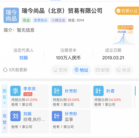 界面记者在天眼查上找到了有关这家公司的信息。天眼查信息显示,瑞金尚品成立于2019年3月,公司实控人为李京京,她持有公司40%的股份,刘振则担任公司高管。这家公司拥有食品经营许可证,但在2019年11月已经申请了简易注销。这个时间点刚好与常宏首次发表声明的时间吻合。