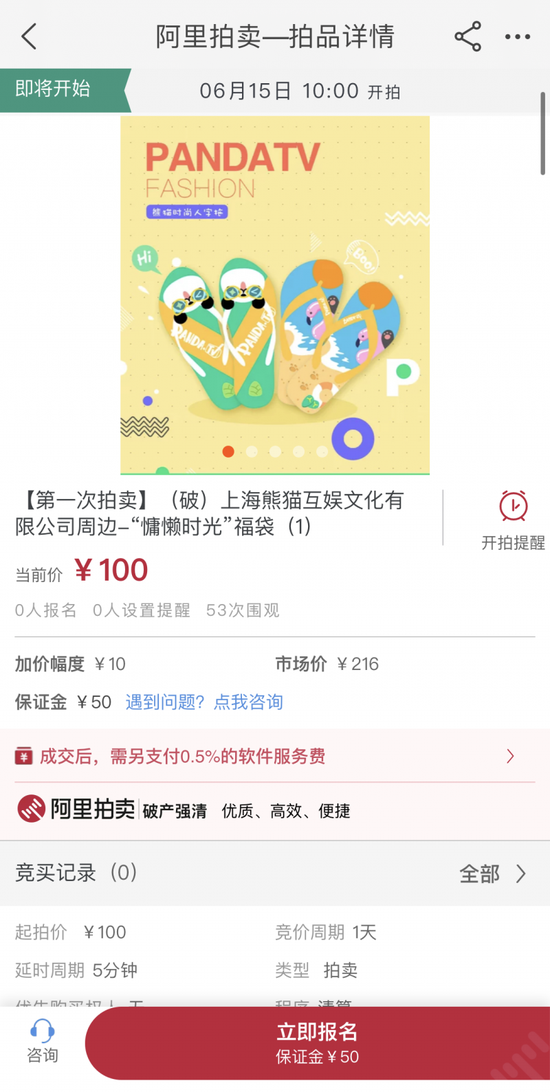 今天,记者在司法拍卖平台注意到,一批熊猫互娱定制周边产品悄然上线。具体标的包括拖鞋、帽子、自拍杆等,单价从20元到2000元不等,23种标的物总计8707元,将于6月15日正式拍卖。