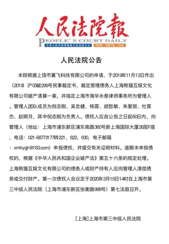 今年1月6日,人民法院公告网披露的公告显示,上海市第三中级人民法院已于2019年11月13日裁定上海熊猫互娱文化有限公司破产清算一案,并于3月进行第一次债权人会议。