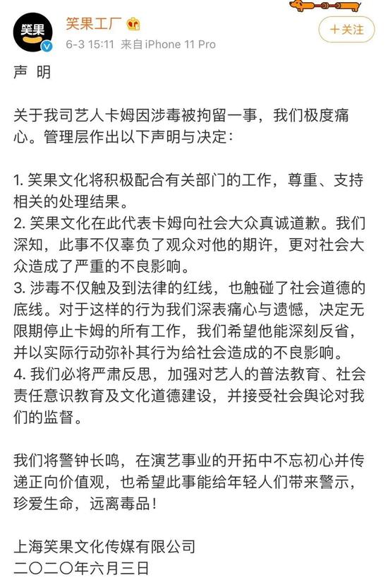 声明承认旗下艺人卡姆涉毒被拘留,表示将积极配合有关部门的工作,尊重、支持相关的处理结果。公司对卡姆涉毒一事极度痛心和遗憾,并代表卡姆向社会大众真诚道歉。另外,笑果工厂还决定无限期停止卡姆的所有工作,希望他能深刻反省,并以实际行动弥补其行为给社会造成的不良影响。