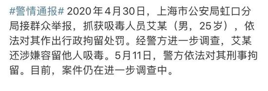 2020年4月30日,上海市公安局虹口分局接群众举报,抓获吸毒人员艾某(男,25岁),依法对其作出行政拘留处罚。经警方进一步调查,艾某还涉嫌容留他人吸毒。5月11日,警方依法对其刑事拘留。目前,案件仍在进一步调查中。