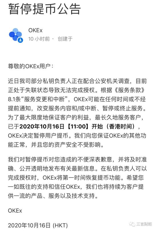 同时,OKEx官网今日发布公告称暂停提币,并且透露公司私钥负责人正配合公安机关调查。