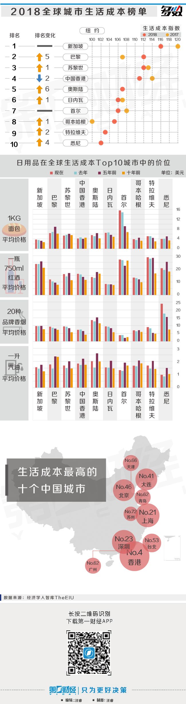 近日,《经济学人》公布了最新的全球生活成本最高的城市榜单,选取了全球 90 多个国家的 130 多个城市。其中,新加坡、巴黎、苏黎世、香港和奥斯陆排名前五,纽约、东京等过去常被认为生活成本最高的城市跌出了前十。除了在这次排行榜中位列第四的香港,中国上海、深圳排在了20名出头,其次是排在41名的大连,而北京位列大连之后,位居46名。