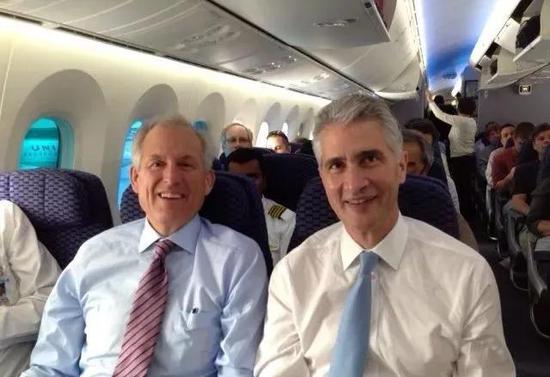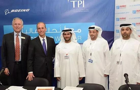 2013年,波音在迪拜航展上收获大单。麦克纳尼与他的接班人、民机集团CEO丹尼斯•米伦伯格(现任波音董事长兼CEO)和客户合影。