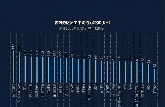最远的是世纪公园和虹桥商务区,通勤距离超过13公里,最近的大连路、大宁这些6公里不到,上海市平均的通勤距离大概是10公里左右。 |