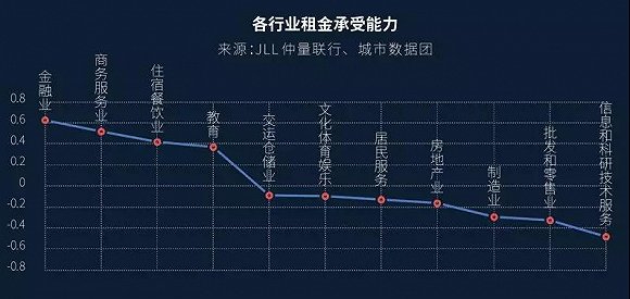 这背后涉及到一个数据,在整个服务行业里面金融、商务服务、科创信息(28.580, -0.74, -2.52%)类的企业,他们对办公的租金的承载力其实是不一样的,我们一直说金融科技在一起,其实我们发现金融和科技他们对房租的承载其实是完全相反的两个曲线,虽然看上去他们应该在一起,但是现实把他们推得越来越远,他们在空间分布上越来越远。