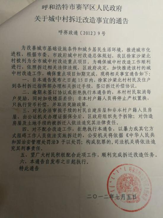 变故发生在2012年7月4日凌晨5点,呼和浩特市赛罕区西把栅乡徐家沙梁北村的1000多名村民还在睡梦中时,一场由赛罕区政府和呼和浩特市土地收购储备拍卖中心组织的强拆彻底改变了村民们的生活。