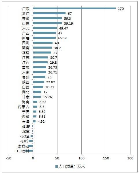 2017年中国各省常住人口增量排行情况,东三省均出现人口负增长(图源:智研咨询网)