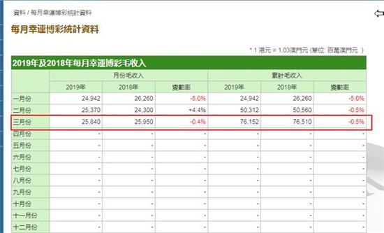 根据澳门特区博彩监察协调局公布的每月幸运博彩统计数据显示,截至2019年3月底,澳门幸运博彩毛收入为258.4亿澳门元,同比微跌0.4%,环比增长1.9%,前3个月澳门幸运博彩累计毛收入为761.52亿澳门元,同比微跌0.5%。