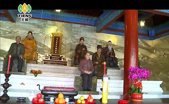 上述宣传资料称,华堂中的崇孝堂正殿内供奉着李氏光祖的雕像,每尊雕像均由整颗金丝楠木雕成。在视频网站优酷上,一则21分钟长,名为《天狮产业园2013年》的视频展现华堂内部疑似建有一座“祠堂”。处于华堂西北角的崇孝堂门口竖立着题有“盛于李唐”四字的牌坊,大门处悬挂着“光祖门”牌匾,内部供奉着“李氏历代列祖列宗”牌位与若干座雕像。对此,张强向澎湃新闻记者确认称,李金元确实在华堂中设立了家族祠堂。从视频内容来看,牌位左侧雕像形象与《唐太宗画像立轴》中的李世民形象相似。