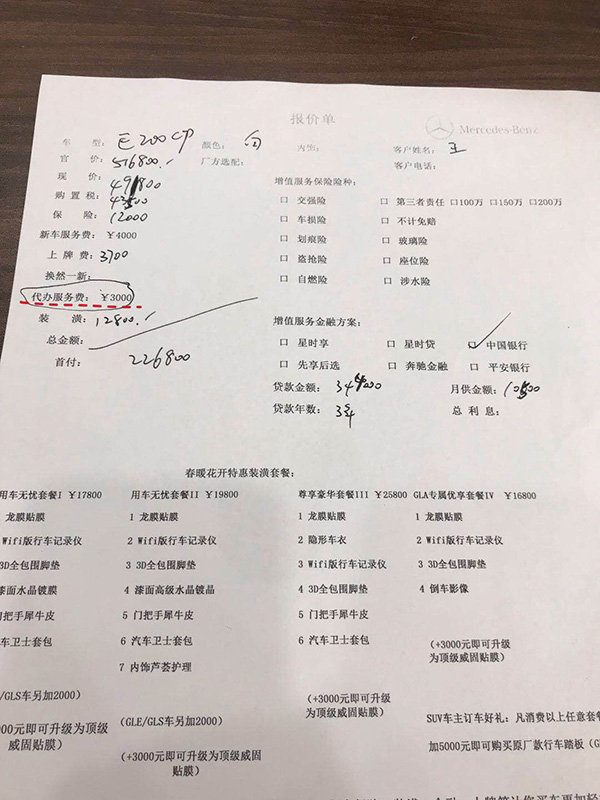 除了金融服务费,奔驰经销商还向顾客收取上牌费(3000-3700元)、装潢费(12800-14800元),其中包括贴膜、脚垫、倒车影像等,每家4S店收费标准不同。此外,奔驰销售人员表示,“因为区域限制,必须由4S店帮车主办理在上海上牌的手续”,不接受客户自行上牌。
