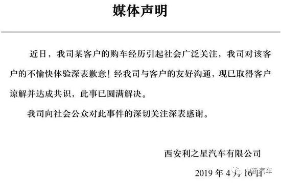 4月16日深夜,西安W女士(化名)及丈夫确认,与4S店达成和解协议。协议内容包括更换同款新车、退还金融服务费、支付交通补偿费一万元、邀请到德国参观工厂、补办农历生日以及赠送十年“一对一”VIP服务。