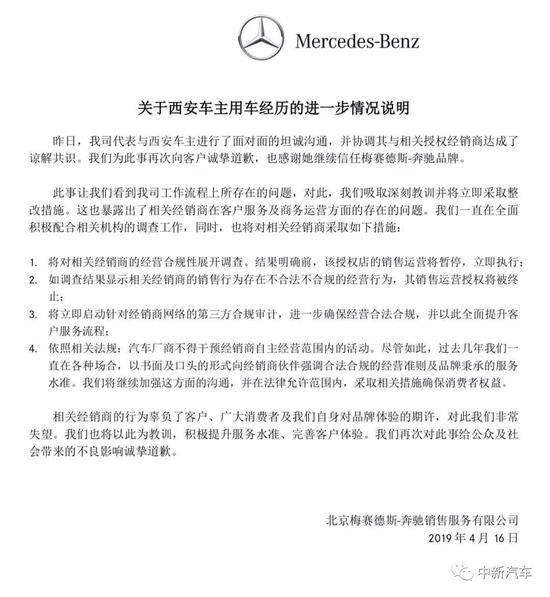 “奔驰于4月16日发布的官方道歉,关停了西安利之星,承诺如果发现违规经营情况,会终止其销售运营授权,让我感受到了诚意,和对方表现出的平等、尊重。”从W女士的言辞中不难看出,“尊重”对于这场交谈的重要性。