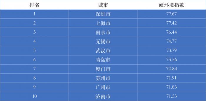硬环境前十名城市(来源:《2019中国城市营商环境指数评价报告》)