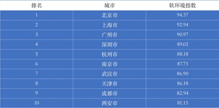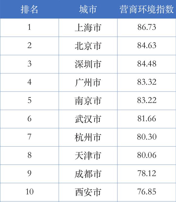 上海营商环境排名居首,北京、深圳紧随其后,广州、南京、武汉、杭州、天津、成都、西安则依次位列前十。