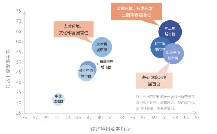 《报告》还对城市群的营商环境进行了比较。其中,珠三角、长三角位列第一梯队,山东半岛和京津冀位列第二梯队,海峡西岸、长江中游、中原城市群位列第三梯队。