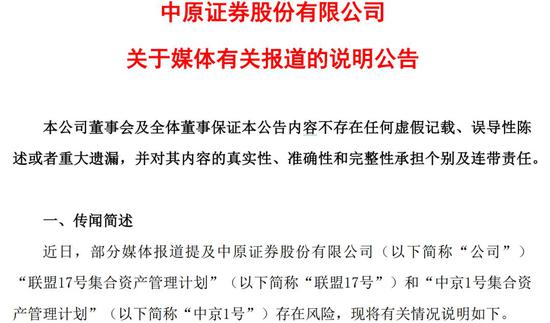 7月11日晚间,中原证券发布公告,证实近日媒体报道提及的“联盟17号集合资产管理计划”(下称“联盟17号”)和“中京1号集合资产管理计划”(下称“中京1号”)存在风险。