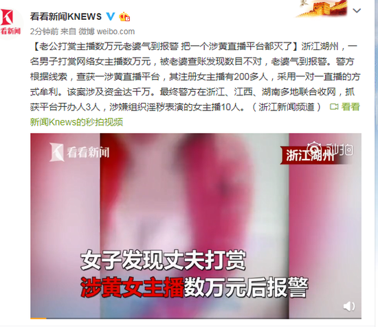 [老公打赏主播数万元老婆气到报警 把一个涉黄直播平台都灭了]浙江湖州,一名男子打赏网络女主播数万元,被老婆查账发现数目不对,老婆气到报警。警方根据线索,查获一涉黄直播平台,其注册女主播有200多人,采用一对一直播的方式牟利。该案涉及资金达千万。最终警方在浙江、江西、湖南多地联合收网,抓获平台开办人3人,涉嫌组织淫秽表演的女主播10人。(浙江新闻频道)