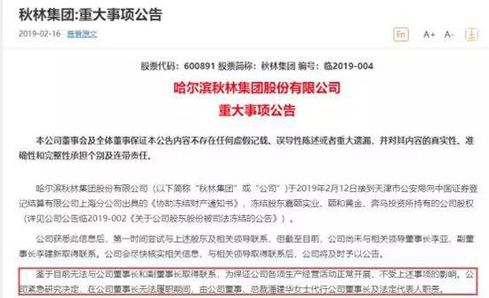 一则大股东股权冻结事项牵出秋林集团董事长李亚、副董事长李建新失联“地雷”。秋林集团由此也成为猪年A股董事长失联的首家上市公司。