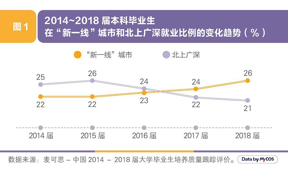 根据上述就业报告,近年来应届本科毕业生在“新一线”城市就业的比例从2014届的22%上升到2018届的26%,在北上广深就业的比例则从2014届的25%下降到2018届的21%。
