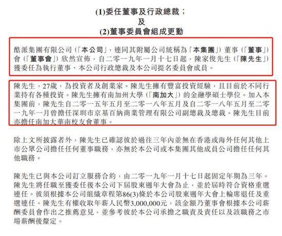 2019年1月17日晚,酷派发布公告称,自1月17日起,陈家俊先生获委任为执行董事、公司行政总裁及本司提名委员会成员。公告显示,陈家俊今年27岁,拥有南加州大学的金融学硕士学位。陈家俊的另一个身份是京基创始人兼董事长陈华的二儿子。