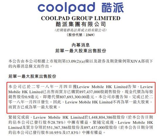 2018年1月,贾跃亭为化解乐视危机,以8.07亿港元价格出售酷派8.97亿股份,贾跃亭旗下的Leview Mobile HK Limited持有的酷派股权降至10.95%,从此不再是酷派的最大股东。而接盘方威日创投有限公司则持有酷派17.83%的股权,也因此晋升为第一大股东,酷派从此易主。