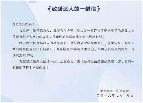 今年1月18日,酷派发布公告称,委任27岁的陈家俊为公司执行董事,行政总裁及公司提名委员会成员,而陈家俊的另一身份则是京基集团创始人、董事长陈华的“二公子”。陈家俊在今日《致酷派人的一封信》中表示,9月份将在国内发布新品手机,并集中研发和营销力量,发力5G市场。