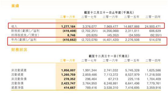 股价大跌有迹可循,复牌之前,酷派刊发了2018年度业绩报告,2018年酷派营业收入为12.77亿港元,同比减少62.19%,期内亏损4.1亿港元,相较2017年净亏损27.23亿港元同比减少84.92%,自2016年以来公司净利润累计亏损达到75.34亿港元,流动负债超出流动资产约11.64亿港元,资产负债率超过80%。