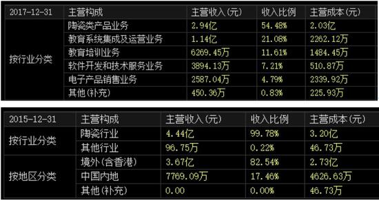 2017年,文化长城陶瓷类产品业务便从过去主营占比99%下降到54%,各类教育系统集成和培训业务已经支撑起公司的半壁江山,文化长城的净利润也从过去的几百万元,跃升到了近亿元。
