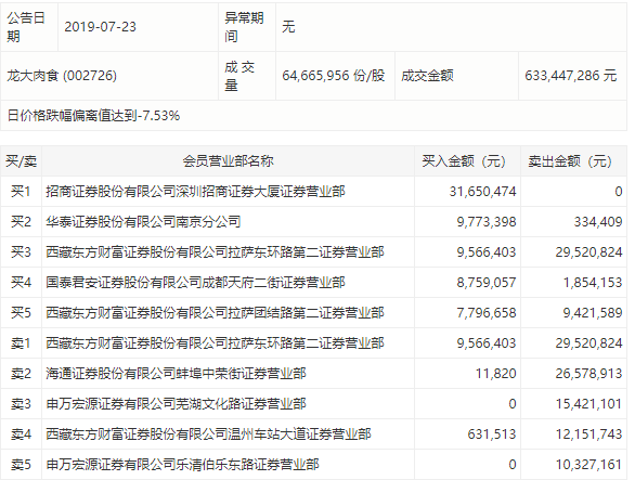 连续两个交易日跌停的龙大肉食,7月23日开盘依旧跌停,尽管临近尾盘股价小幅回升,该股日价格跌幅偏离值仍达到7.53%,距离7月18日创出的13.9元的高点已经跌超20%。
