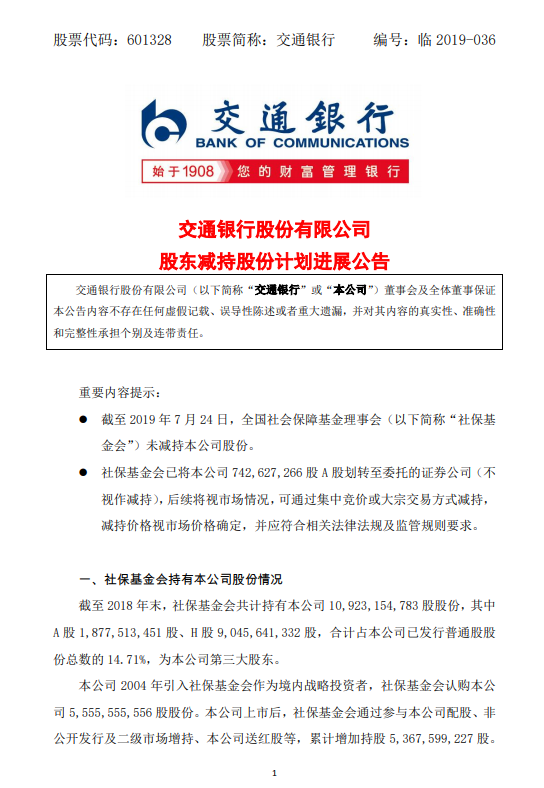新浪财经讯 7月24日消息,交通银行(601328)7月24日晚间公告,截至7月24日,社保基金会未减持公司股份。未来三个月内,社保基金会将视市场情况减持,减持不超过7.43亿股A股,即不超过公司总股本的1%。上述情况与此前社保基金会的减持股份计划一致。社保基金会已将公司7.43亿股A股划转至委托的证券公司,由其独立自主管理,可通过集中竞价或大宗交易方式减持。