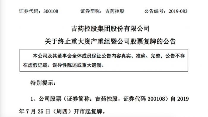 与此同时,吉药控股表示,本次重大资产重组的交易双方于 2019 年 7 月 10 日共同签署了《意向协议》,但未就具体交易方案最终达成实质性协议。