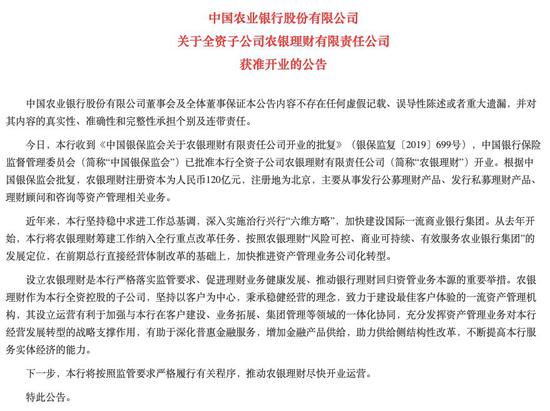 此外农行还称,将按照监管要求严格履行有关程序,推动农银理财尽快开业运营。