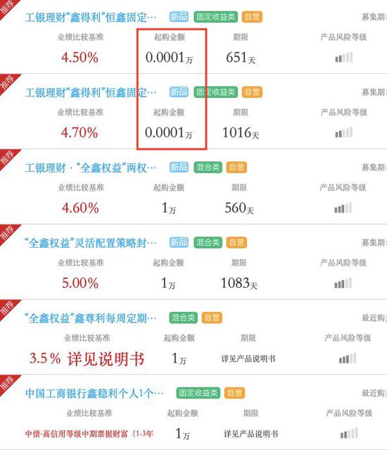基金君发现,工银理财“添利宝”、“鑫得利”、“鑫稳利”、“鑫天益”、“全鑫权益”等系列的9款理财产品,近期均在官方渠道有售,其中2款产品的认购起点金额为1元,另有7款认购起点金额为1万元。