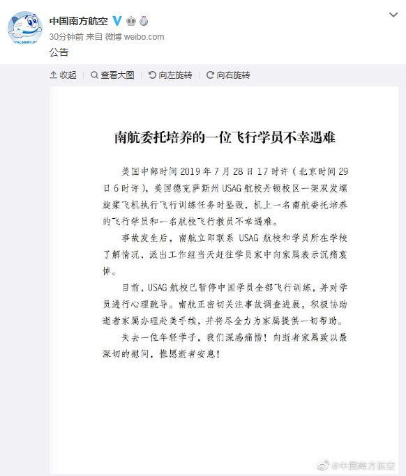 中国南方航空公司在公告中表示:美国中部时间2019年7月28日17时许(北京时间29日6时许),美国德克萨斯州USAG航校丹顿校区一架双主螺旋桨飞机执行飞行训练任务时坠毁,机上一名南航委托培养的飞行学员和一名航校飞行教员不幸遇难。