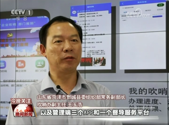 鄄城县委组织部常务副部长、吹哨办副主任王玉浩表示,这套系统包括了企业端部门端以及管理端三个APP和一个督导服务平台,企业吹哨向平台反映的问题,随即推送给相关部门,一小时内部门要给企业报到。