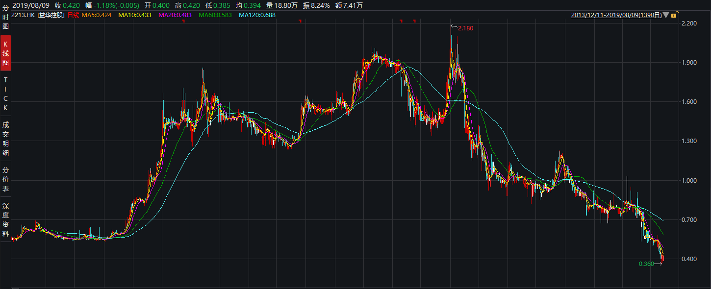 由于业绩表现不佳,益华控股股价也同样萎靡不振。8月5日,益华控股以0.36港元/股开盘,创下公司上市以来的新低。而截至8月9日,益华控股在港股市场的市值仅为4.21亿港元。