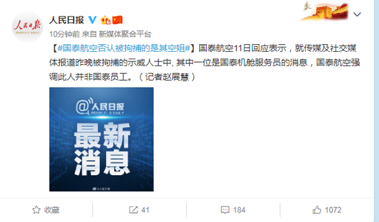 国泰航空11日回应表示,就传媒及社交媒体报道昨晚被拘捕的示威人士中, 其中一位是国泰机舱服务员的消息,国泰航空强调此人并非国泰员工。(记者赵展慧)