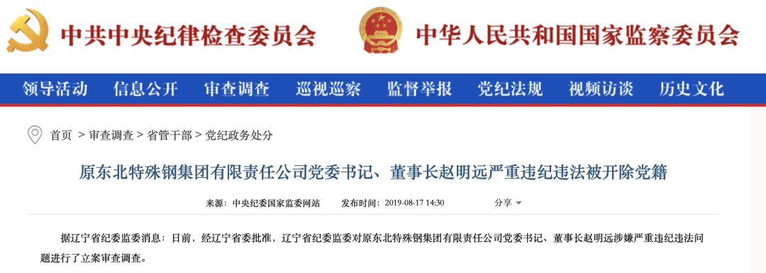 |  来源:每日经济新闻   巨大的反差让人惊讶。公开资料显示,赵明远自1969年12月份参加工作以来,从东北特钢的前身大连钢厂水汽车间的一名普通工人一直做到了东北特钢集团的最高职位。曾大刀阔斧剔除沉疴,把大连钢厂、抚顺钢厂和北满特钢,紧紧绑在了一架战车上,成立了东北特钢集团(注:北方最大的特殊钢铁生产公司),并任党委书记、董事长。2016年2月,赵明远正式退休,从担任大连钢厂厂长算起,他“一把手”的生涯一共19年。   值得一提的是,赵明远退休后不久,东北特钢出现重大财务问题,半年内连续十次债券违约,涉及债券金额共计71亿元,最终实施破产重组。   此外,在今年7月,东北特钢集团旗下上市公司ST抚钢(原抚顺特钢)称公司收到中国证监会《行政处罚及市场禁入事先告知书》(以下简称《告知书》),《告知书》显示,抚顺特钢连续8年财务造假,虚增利润19亿元,曾担任董事长的赵明远终身禁入市场,并被处以30万元罚款。   被开除党籍   8月17日,据中纪委官网援引辽宁省纪委监委消息:日前,经辽宁省委批准,辽宁省纪委监委对原东北特殊钢集团有限责任公司党委书记、董事长赵明远涉嫌严重违纪违法问题进行了立案审查调查。