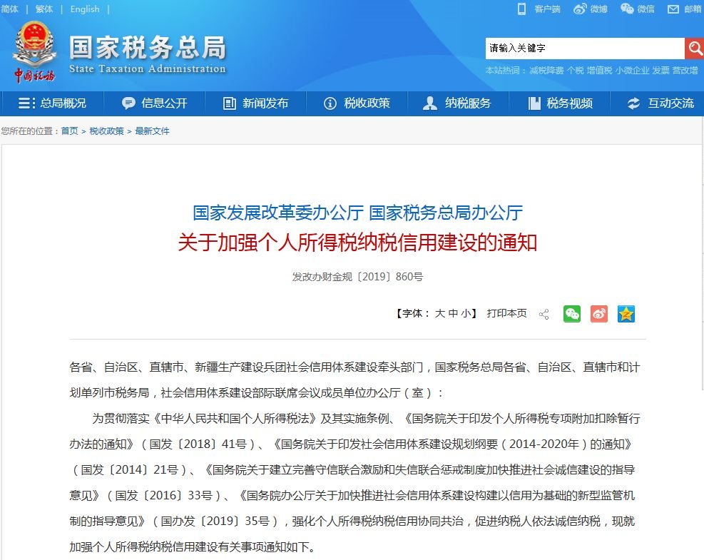 近日,发改委、税务总局联合印发《关于加强个人所得税纳税信用建设的通知》(以下简称《通知》),提出建立健全个税纳税信用记录,完善守信激励与失信惩戒机制。