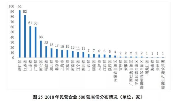 浙江、江苏、山东和广东四个沿海大省的上榜民企数量明显高出一档,其中浙江92家,江苏83家,山东61家,广东60家。