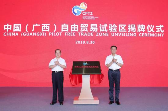 今天(8月30日)上午,中国(广西)自由贸易试验区正式揭牌运行。自治区党委书记、自治区人大常委会主任鹿心社,自治区党委副书记、自治区主席陈武共同为自贸试验区揭牌。