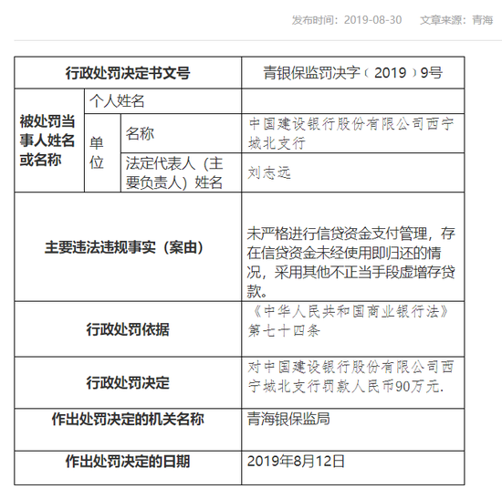 新浪财经讯 9月2日消息,青海银保监局近日发布行政处罚信息公示表显示,建行西宁城北支行因未严格进行信贷资金支付管理,存在信贷资金未经使用即归还的情况,采用其他不正当手段虚增存贷款,被罚款90万元。