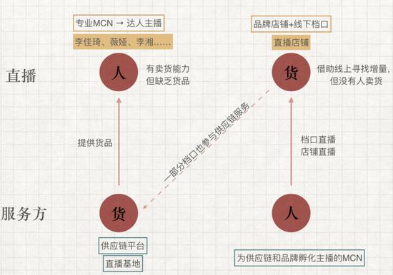在文章开始前,我们可以先用上图的模型理解整个淘宝直播生态:“人”和“货“构成了淘宝直播的两大维度,一类是围绕人的达人直播,一类是围绕货的店铺直播,也由此衍生出不同的服务商。