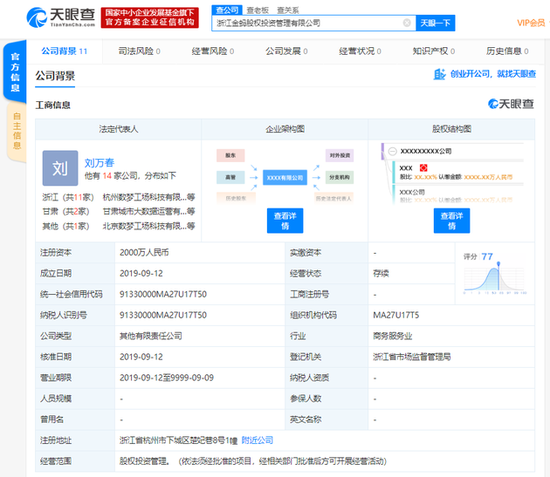 天眼查数据显示,浙江金蚂股权投资管理有限公司注册资本为2000万人民币,经营范围为股权投资管理。该公司股东还包括由浙江省金融控股有限公司(以下简称:浙江金控)全资控股的浙江金控投资有限公司(持股比例37%),杭州数梦工场科技有限公司(以下简称:数梦工场)全资控股的杭州数梦科创投资管理有限公司(持股比例15%)。